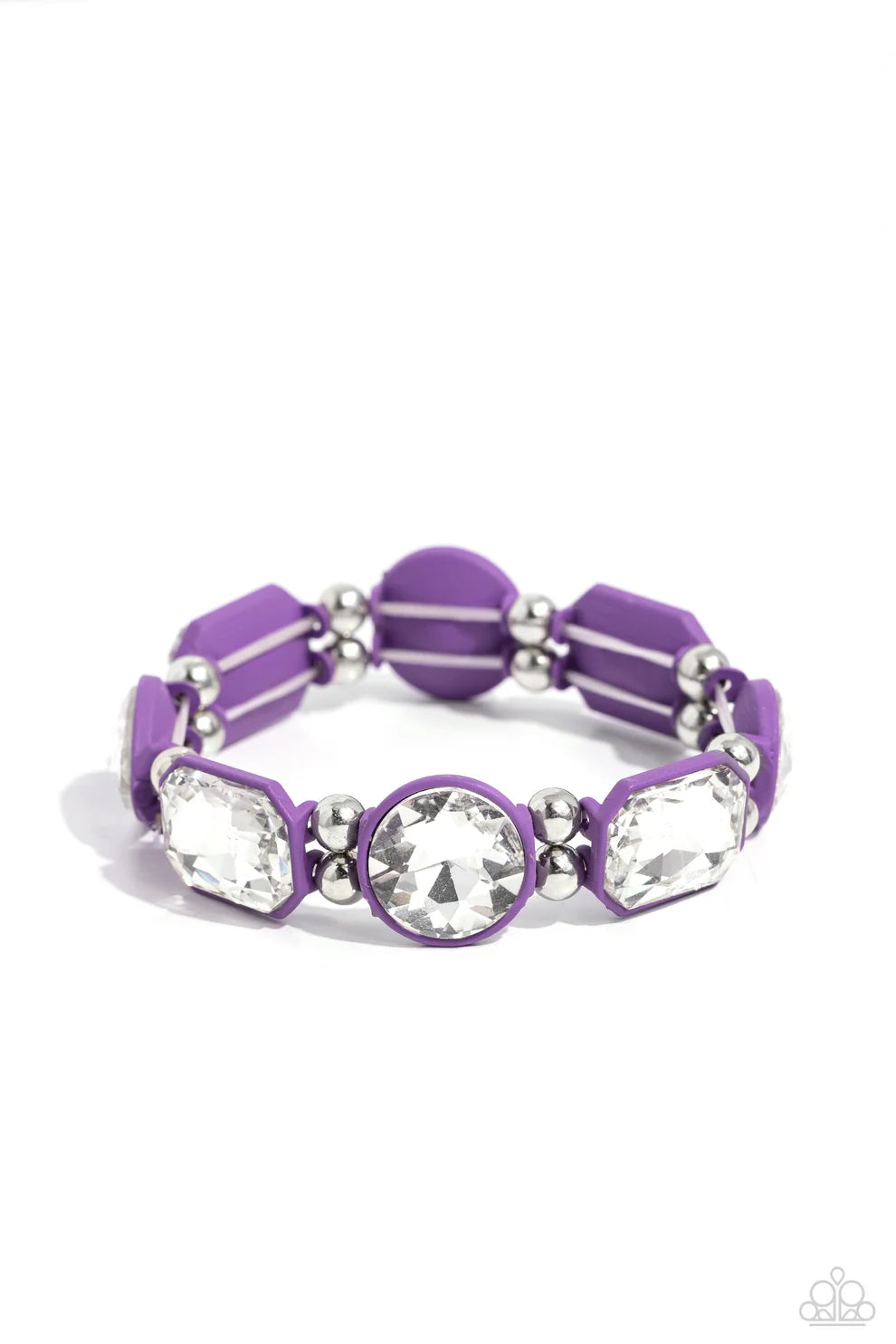 Featuring purple rubber frames, a glassy collection of white round, teardrop, and emerald-cut gems link around the wrist on an elastic stretchy band for a colorfully classic look. Stacked silver beads alternate between each frame, infusing the design with a touch of industrial sheen.