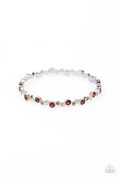 Encased in sleek silver fittings, a twinkly collection of topaz, golden topaz, and white rhinestones coalesce into a glittery bangle around the wrist.
