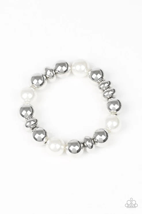 A collection of shiny silver beads and pearly white beads are threaded along a stretchy band around the wrist for a refined look. Sold as one individual bracelet.